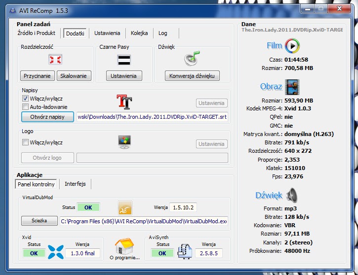 programu AVI ReComp możemy łatwo, przeprowadzić rekompresję filmów w formacie AVI jak też dodać na stałe napisy dialogowe do filmu.